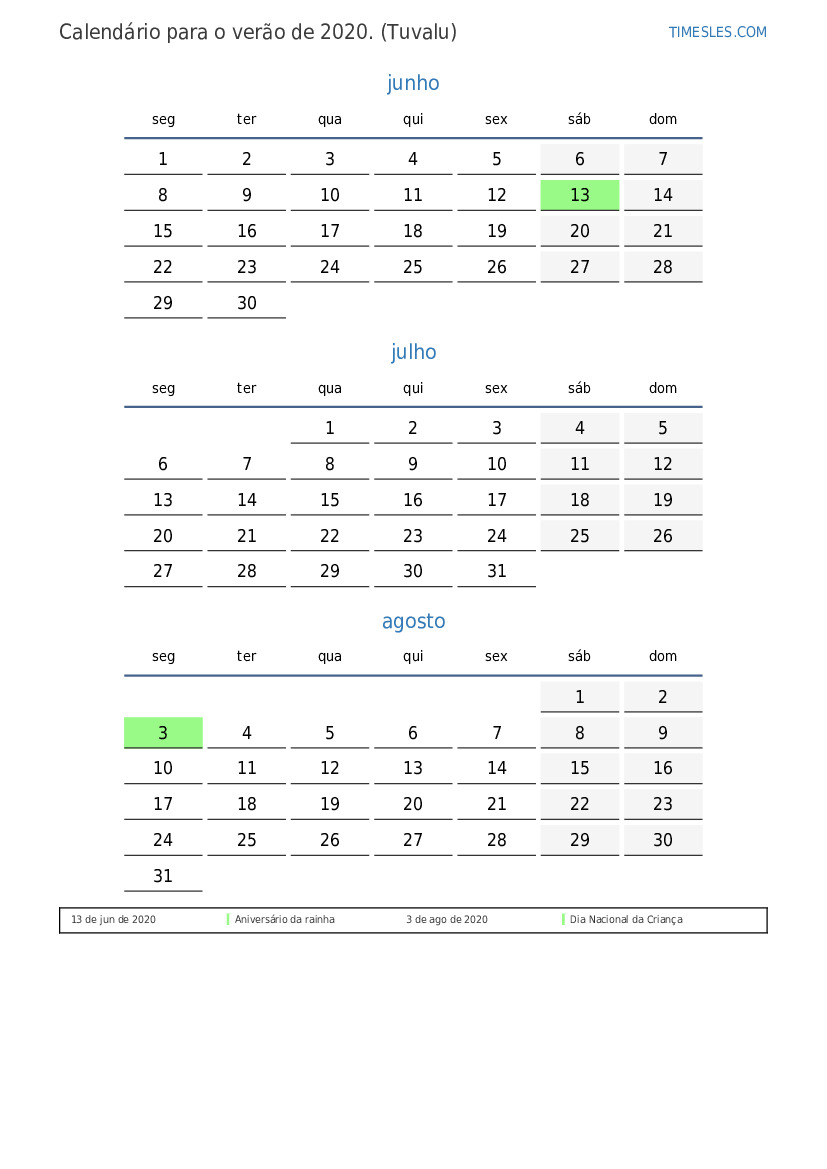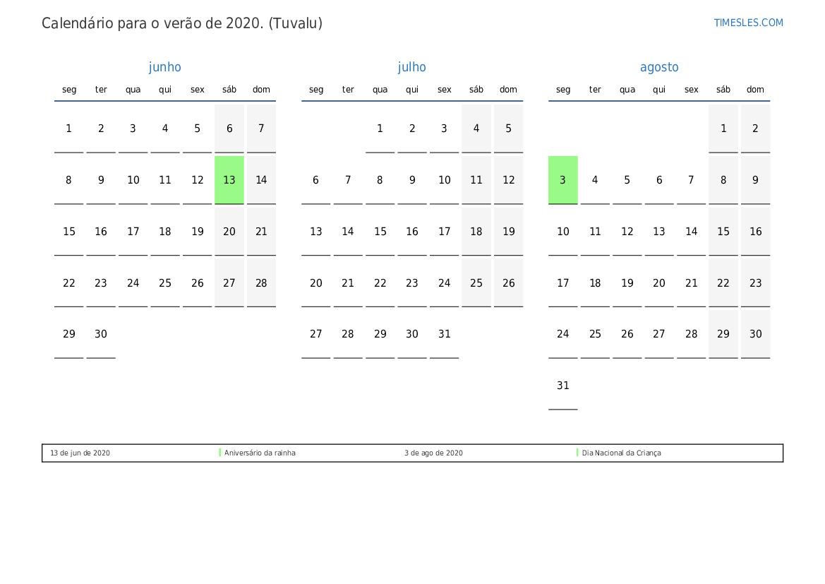 Calendário para o verão de 2020 para Tuvalu