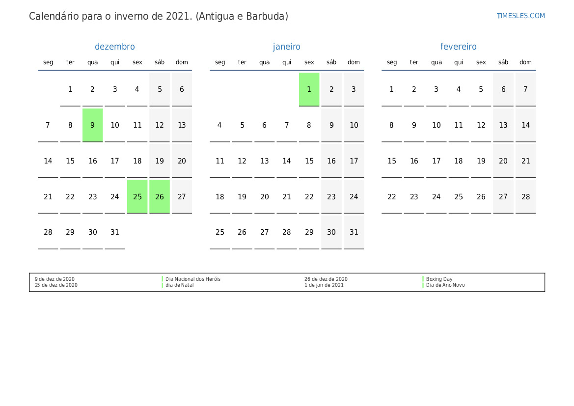 Calendário para o verão de 2021 para Antigua e Barbuda