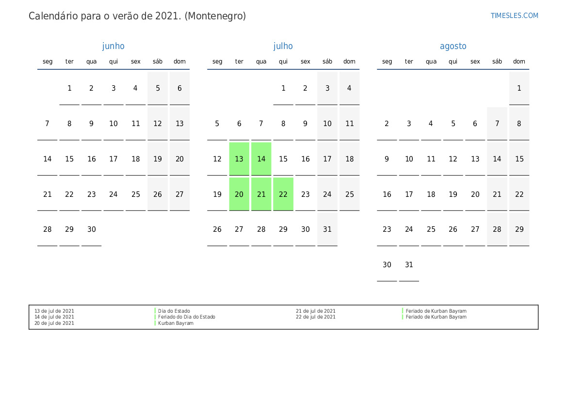 Baixe e imprima calendário em PDF com feriados e fins de semana para o verão de 2021 para Montenegro