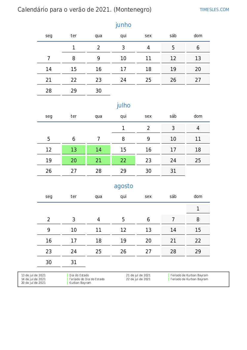 Calendário de feriados e fins de semana para o verão de 2021 para Montenegro
