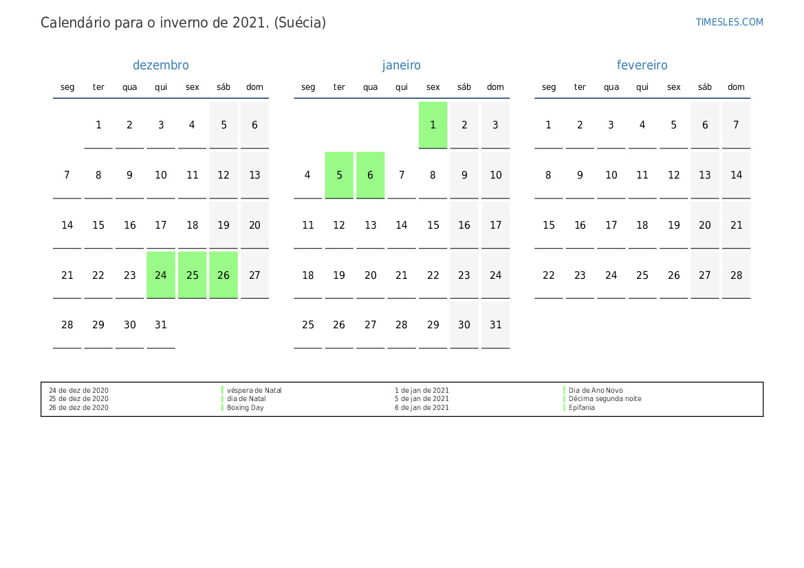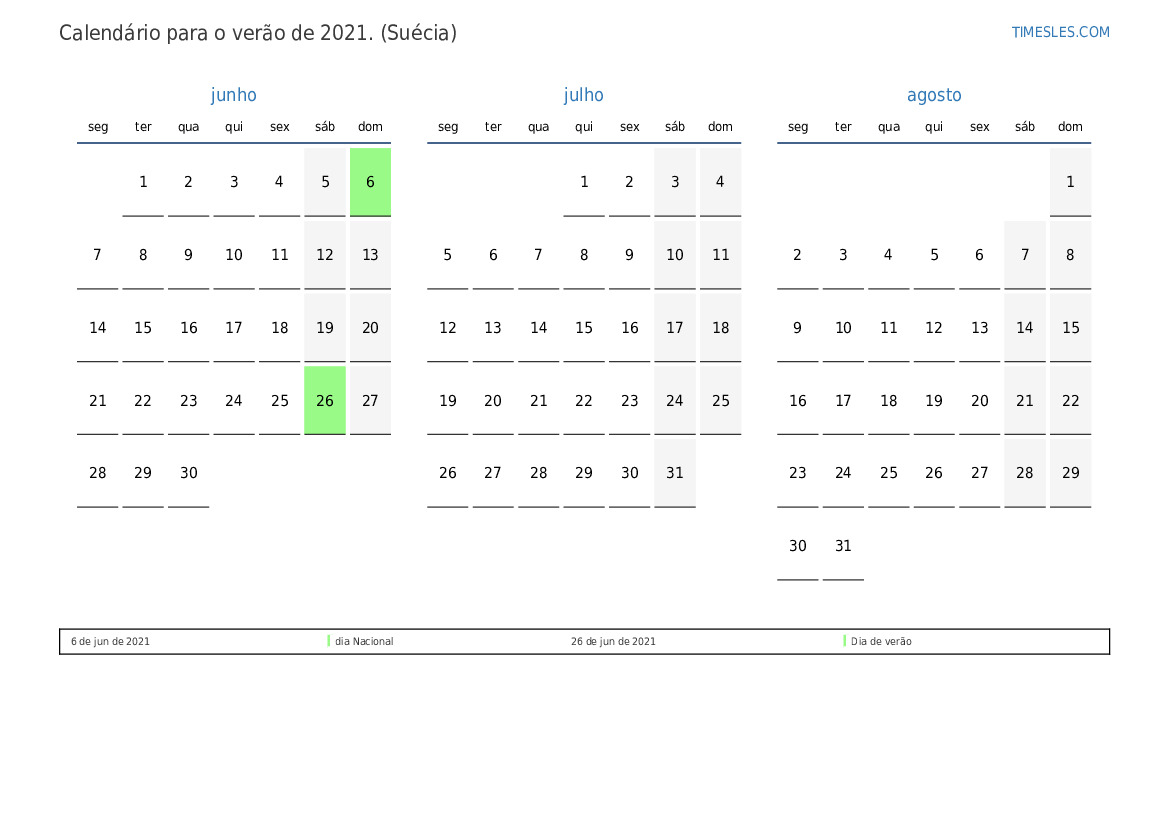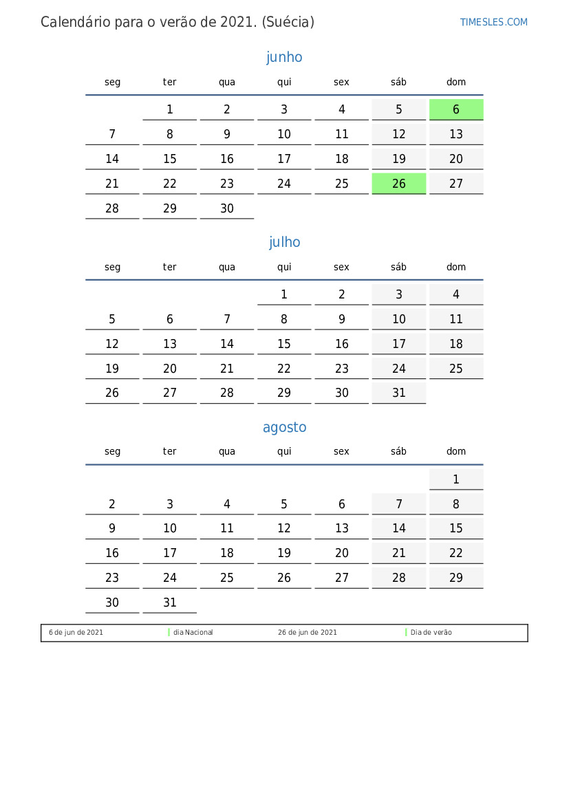 No verão de 2021, há 4 feriados e dias de folga Na Suécia. Verão 2021 começa na terça-feira e termina na terça-feira.