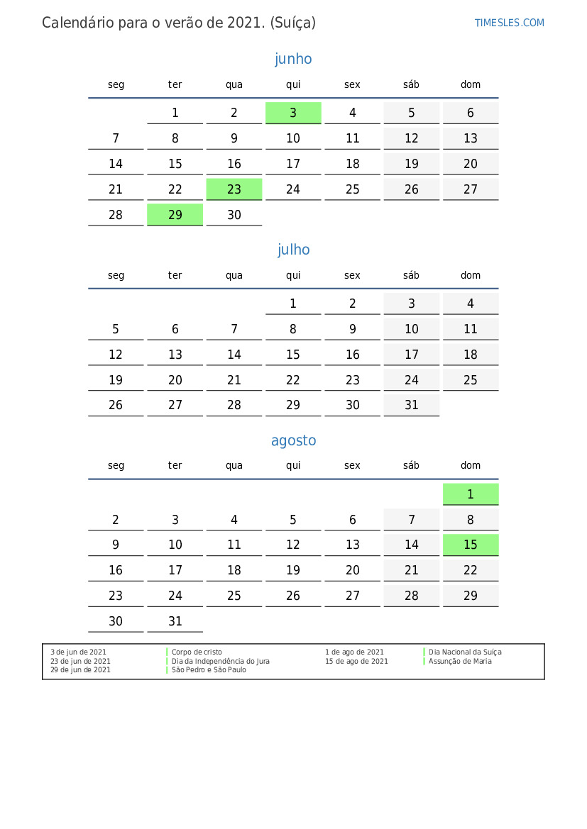 No verão de 2021, há 6 feriados e dias de folga na Suíça. Verão 2021 começa na terça-feira e termina na terça-feira.