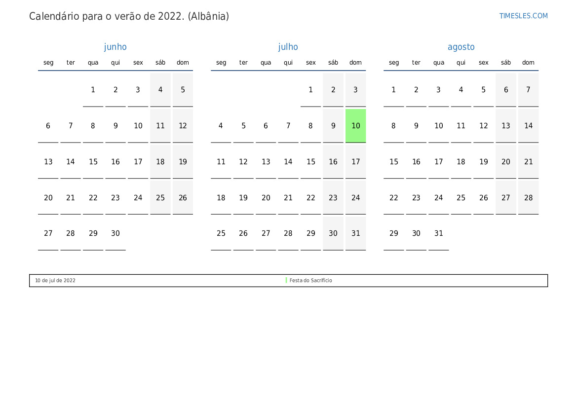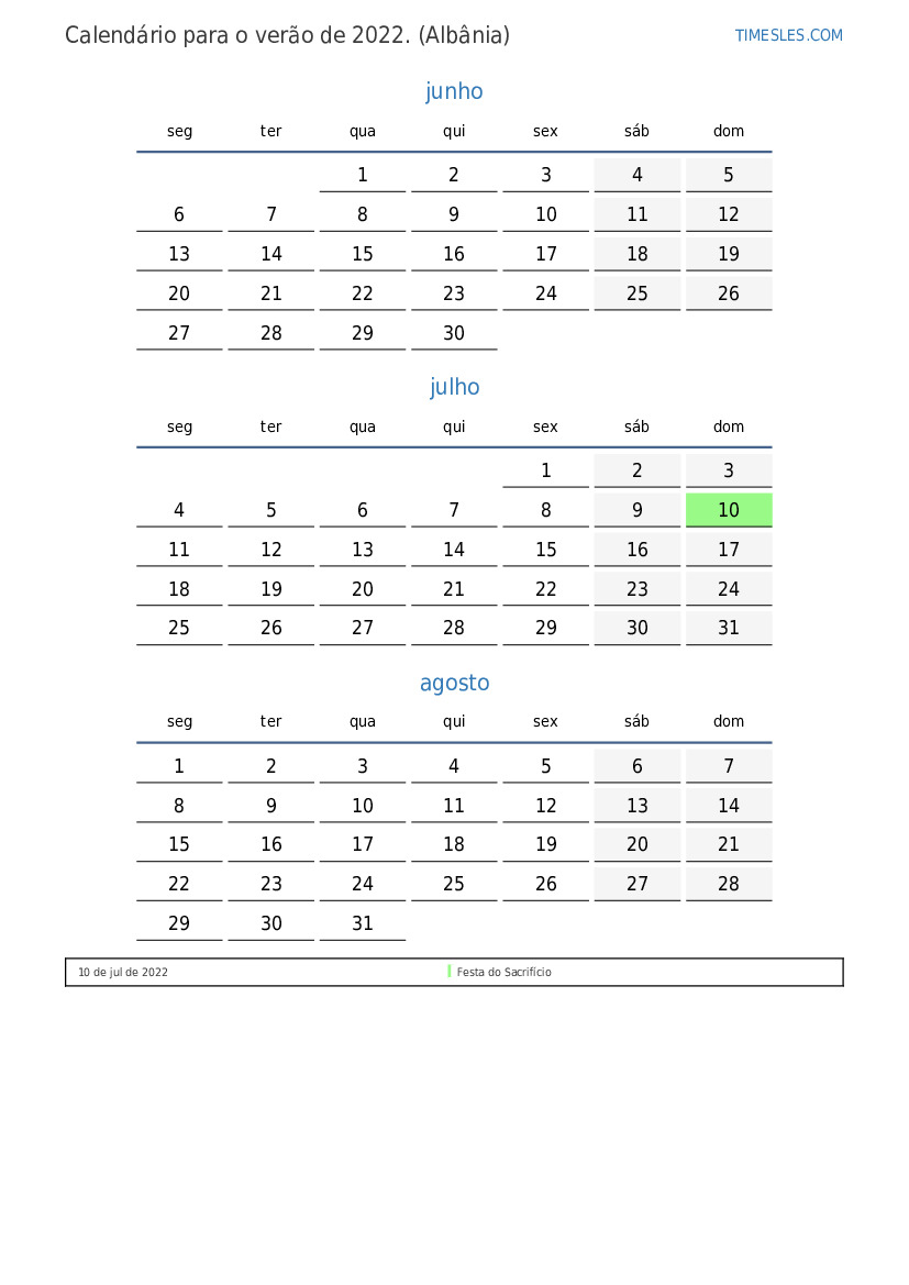 Baixe e imprima calendário em PDF com feriados e fins de semana para o verão de 2022 para a Albânia