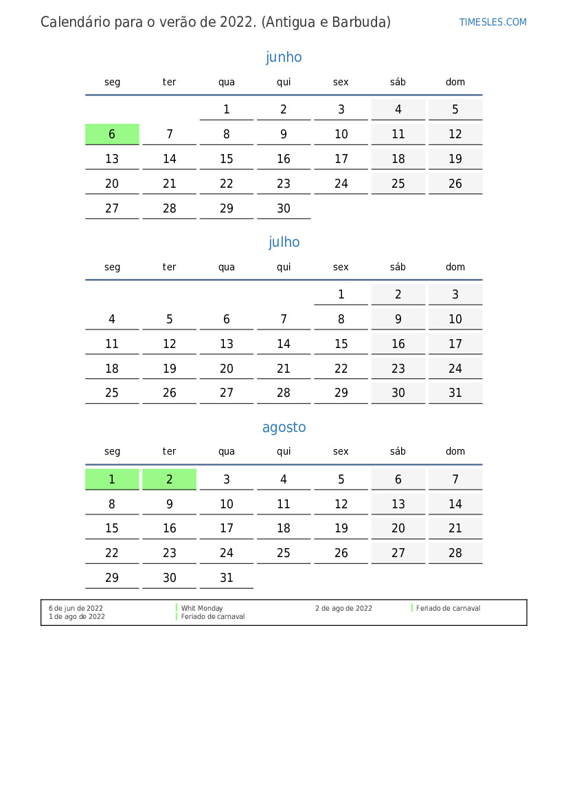 Calendário para o verão de 2022 para Antigua e Barbuda