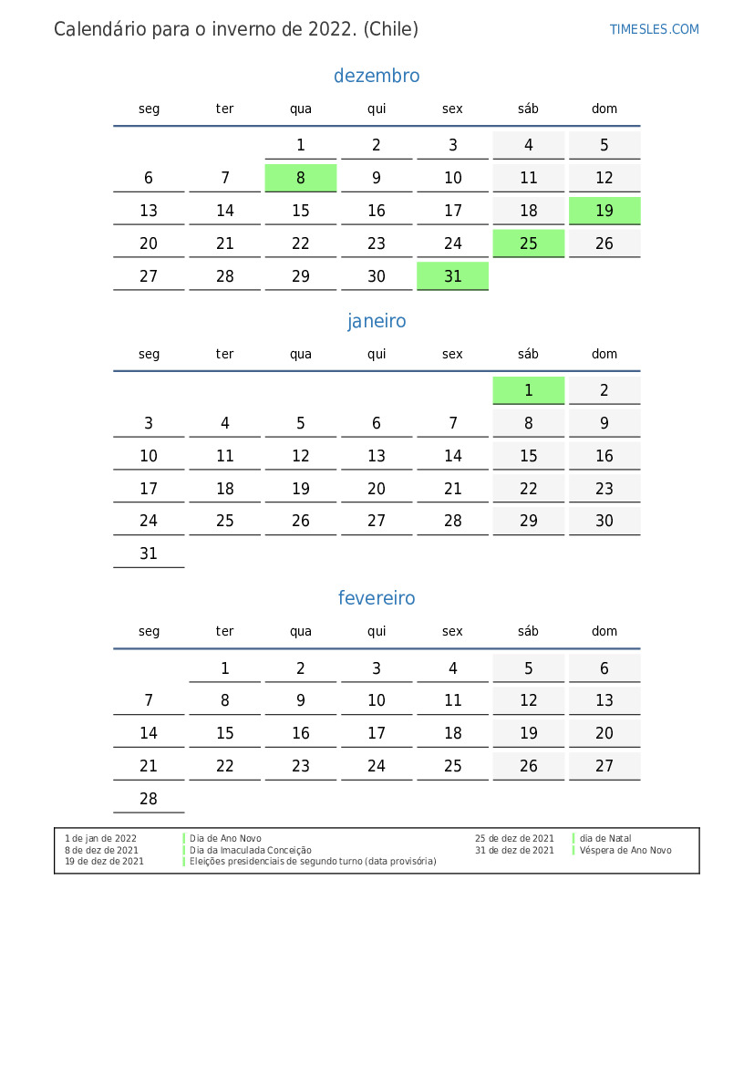 No verão de 2022, há 5 feriados e dias de folga No Chile. Verão 2021 começa na quarta-feira e termina na quarta-feira.