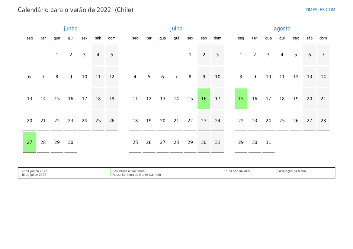 Baixe e imprima calendário em PDF com feriados e fins de semana para o verão de 2022 para o Chile
