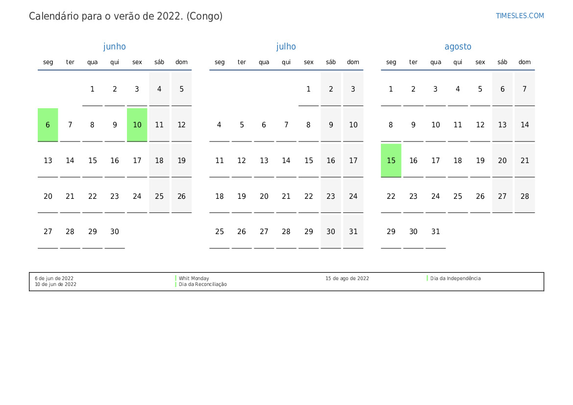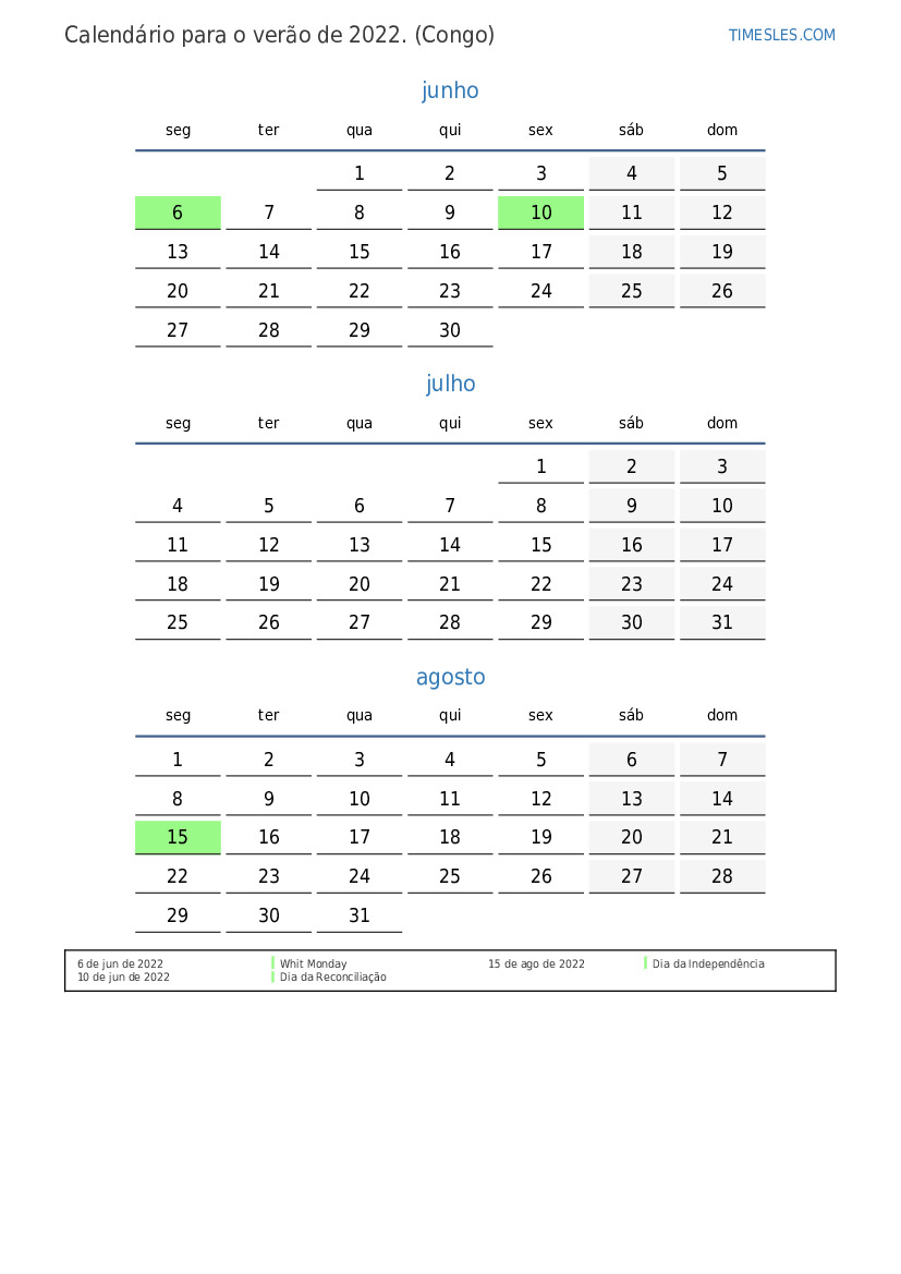 Baixe e imprima calendário em PDF com feriados e fins de semana para o verão de 2022 para o congo