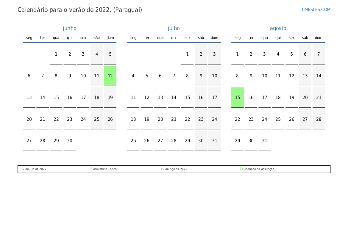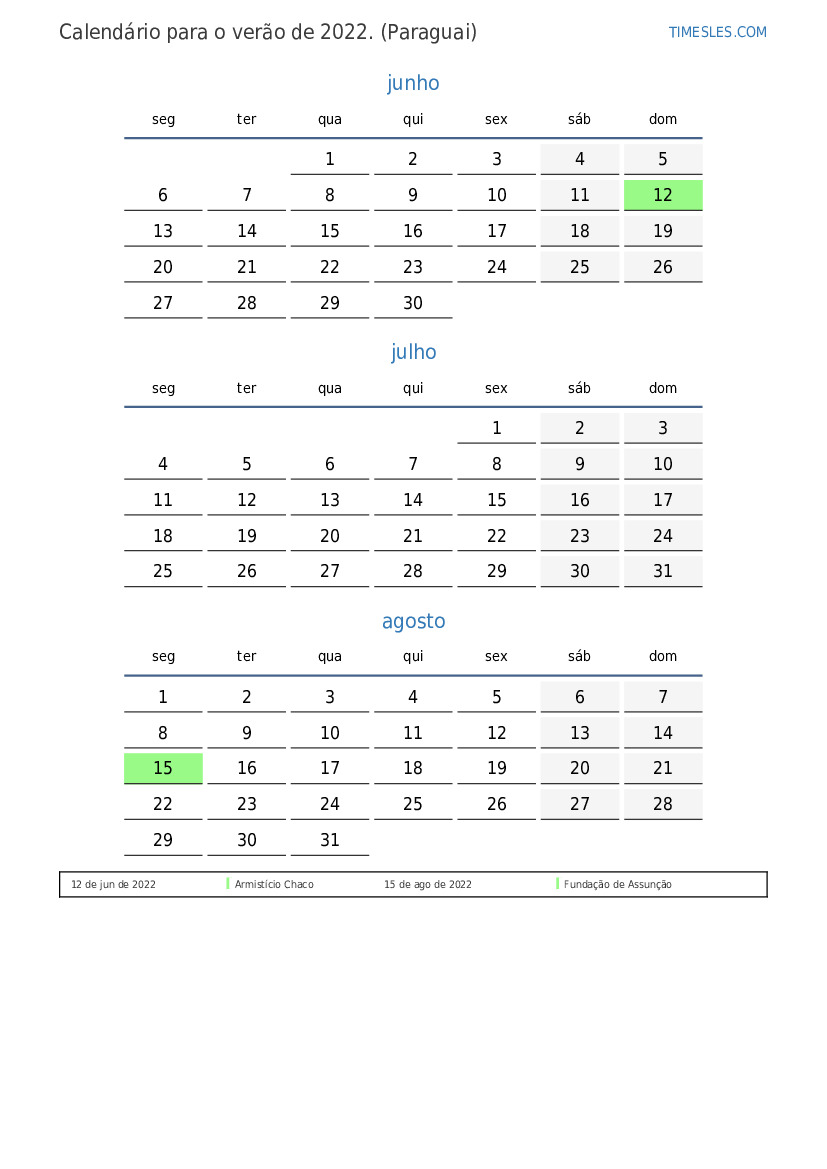 Calendário para o verão de 2022 para o paraguai