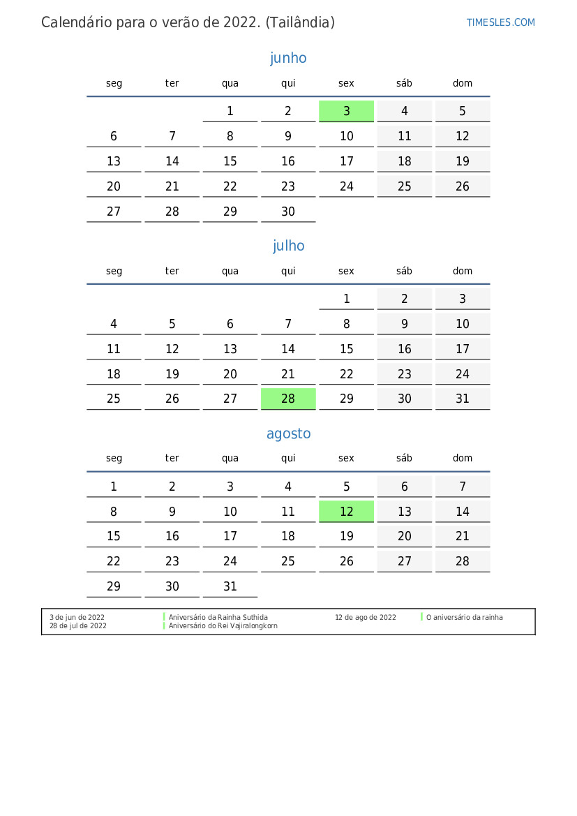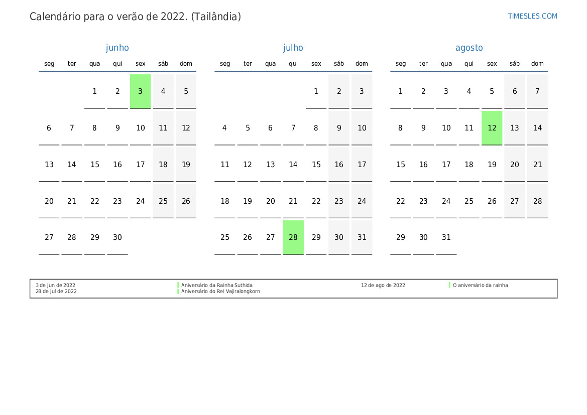 Baixe e imprima calendário em PDF com feriados e fins de semana para o verão de 2022 para a Tailândia