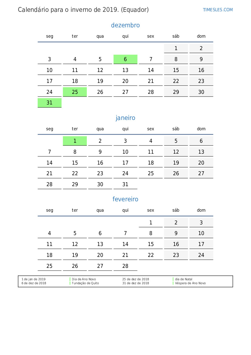 Calendário de feriados e fins de semana para o inverno de 2019 para o equador