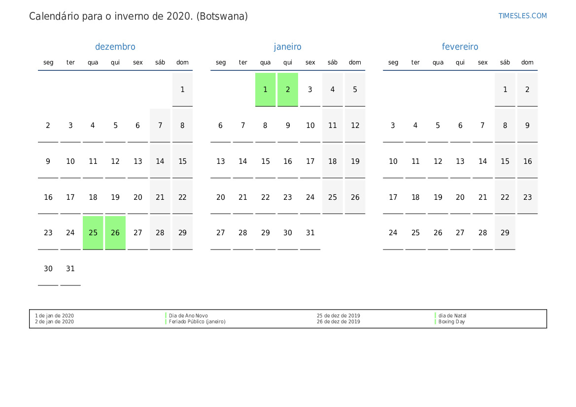 Baixe e imprima calendário em PDF com feriados e fins de semana para o inverno de 2020 para o Botswana
