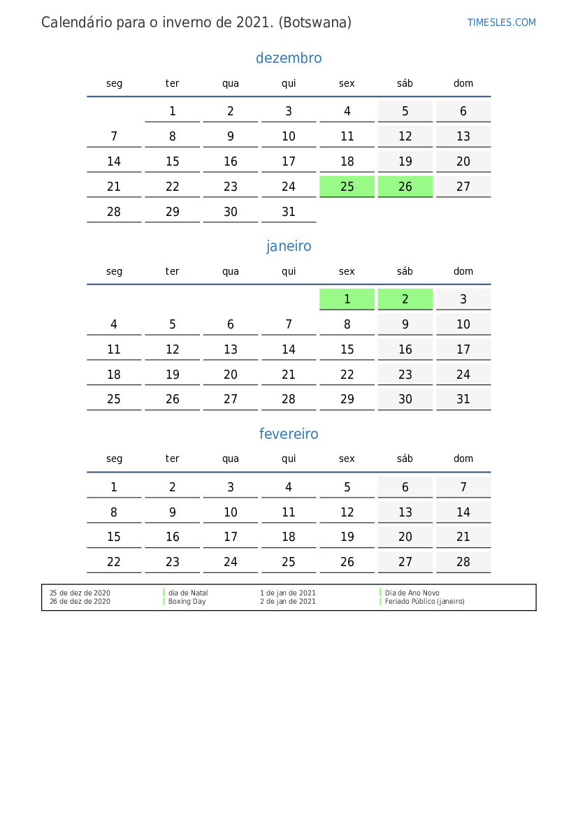 Baixe e imprima calendário em PDF com feriados e fins de semana para o inverno de 2021 para o Botswana