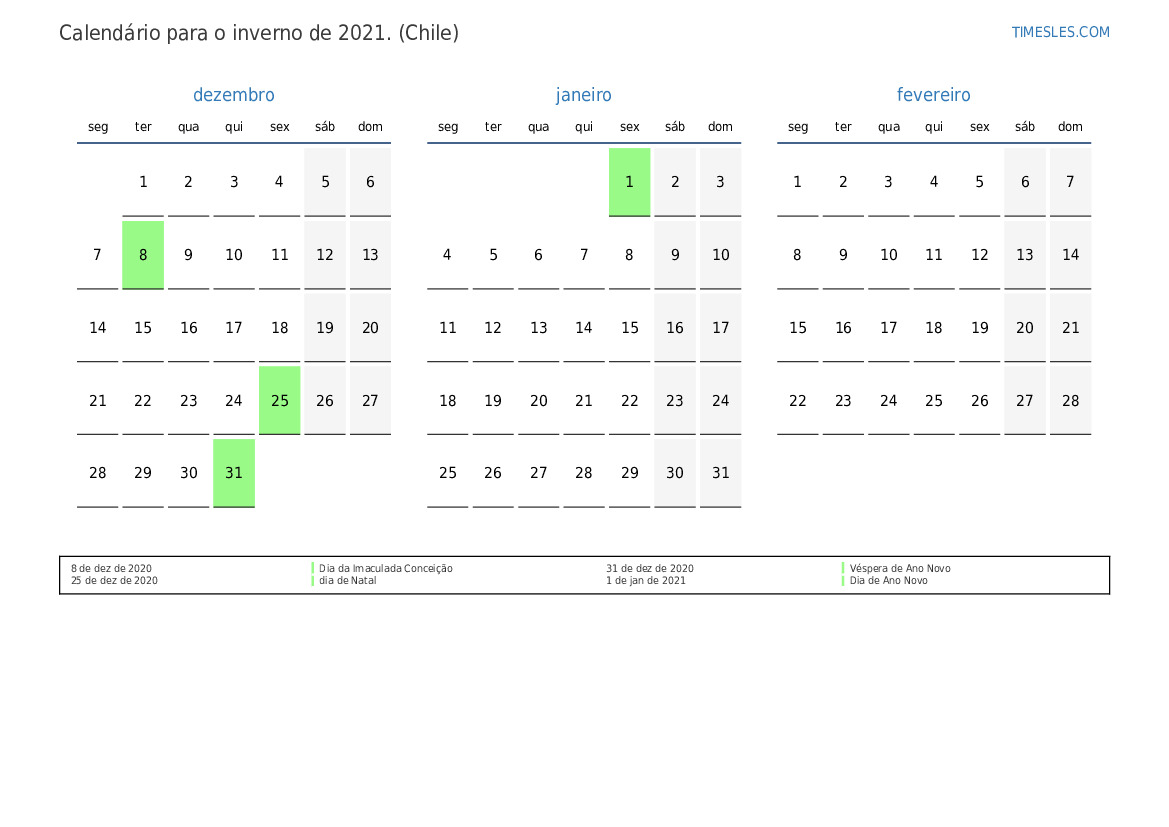 No inverno de 2021, há 5 feriados e dias de folga No Chile. Inverno 2021 começa na terça-feira e termina no domingo.
