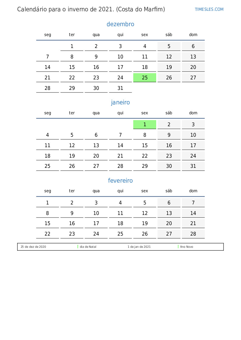 No inverno de 2021, há 3 feriados e dias de folga na Cote d'Ivoire. Inverno 2021 começa na terça-feira e termina no domingo.