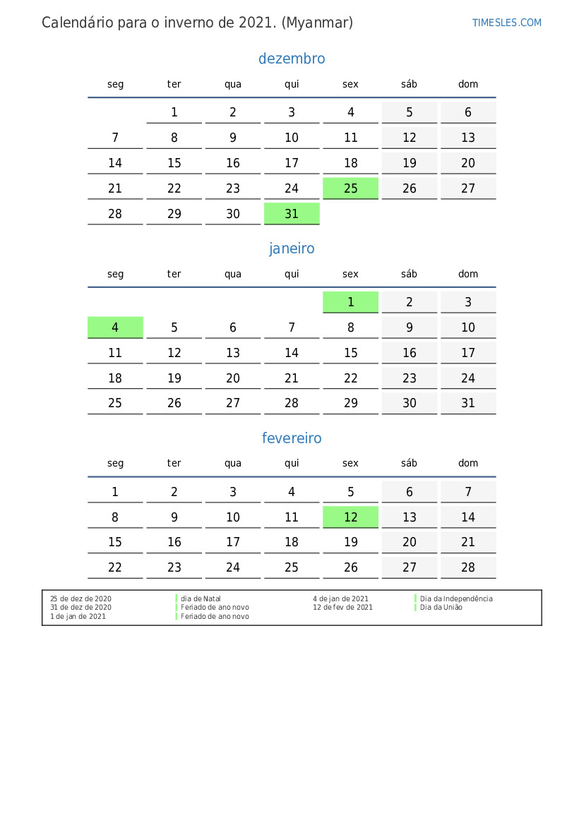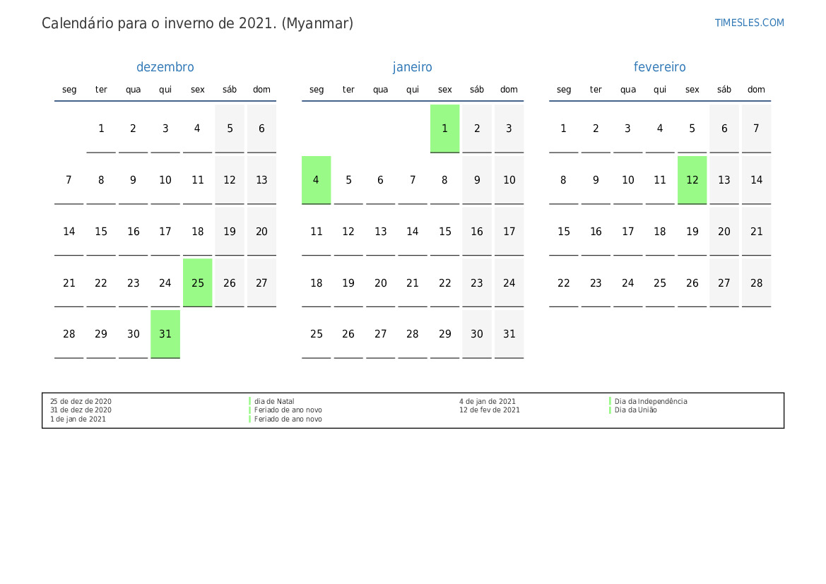 Calendário para o inverno de 2021 para Mianmar