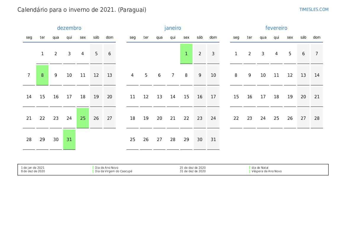 Calendário de feriados e fins de semana para o inverno de 2021 para o paraguai