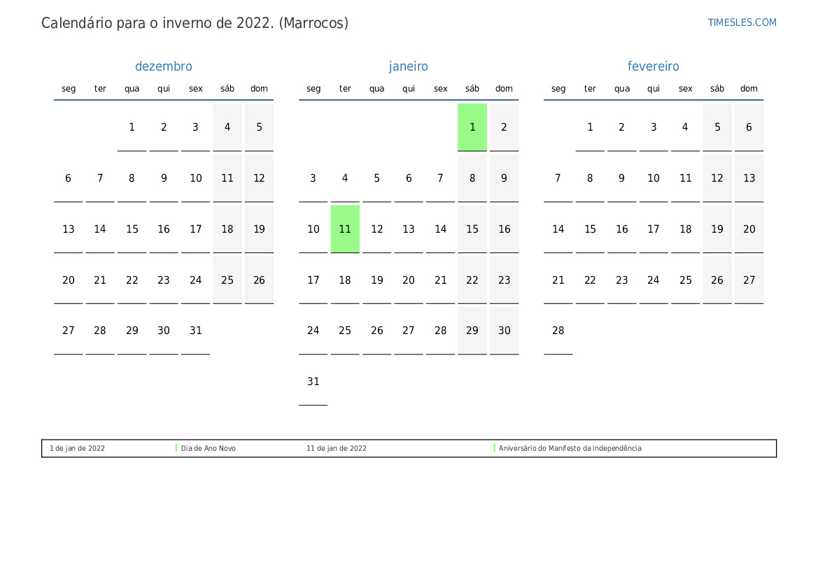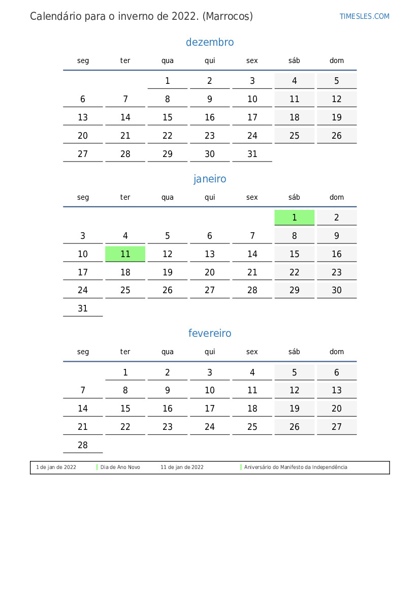 No inverno de 2022, há 3 feriados e dias de folga Em Marrocos. Inverno 2021 começa na quarta-feira e termina na segunda-feira.