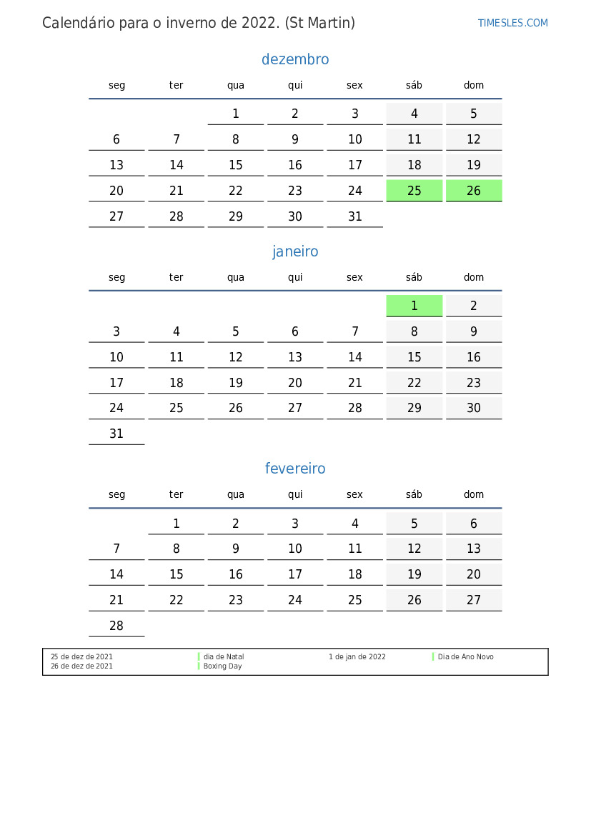 No inverno de 2022, há 4 feriados e dias de folga em Sint Maarten. Inverno 2021 começa na quarta-feira e termina na segunda-feira.