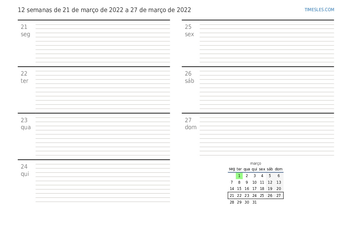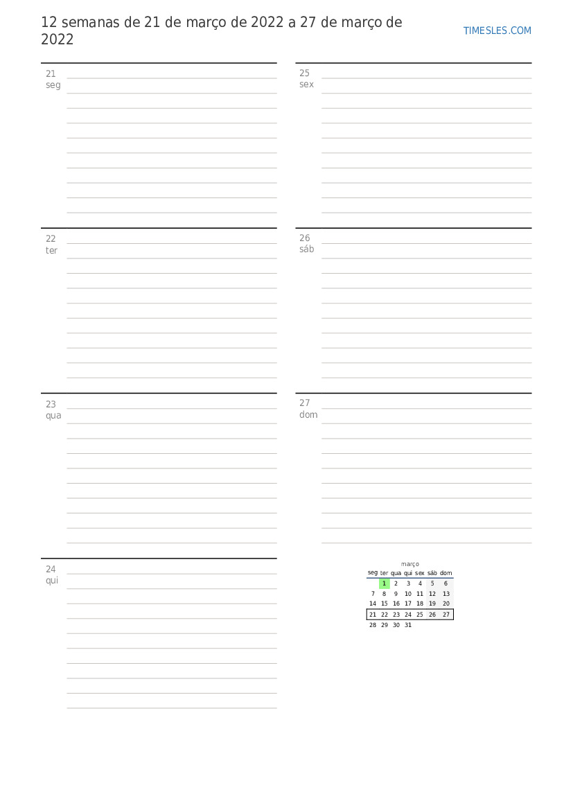 Baixe e imprima calendário em PDF semanalmente para a 12 semana de 2022, de 21 de março de 2022 a 27 de março de 2022
