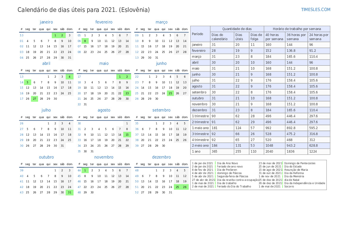 Baixe e imprima o calendário de dias úteis em PDF para agosto de 2021 para a Eslovênia