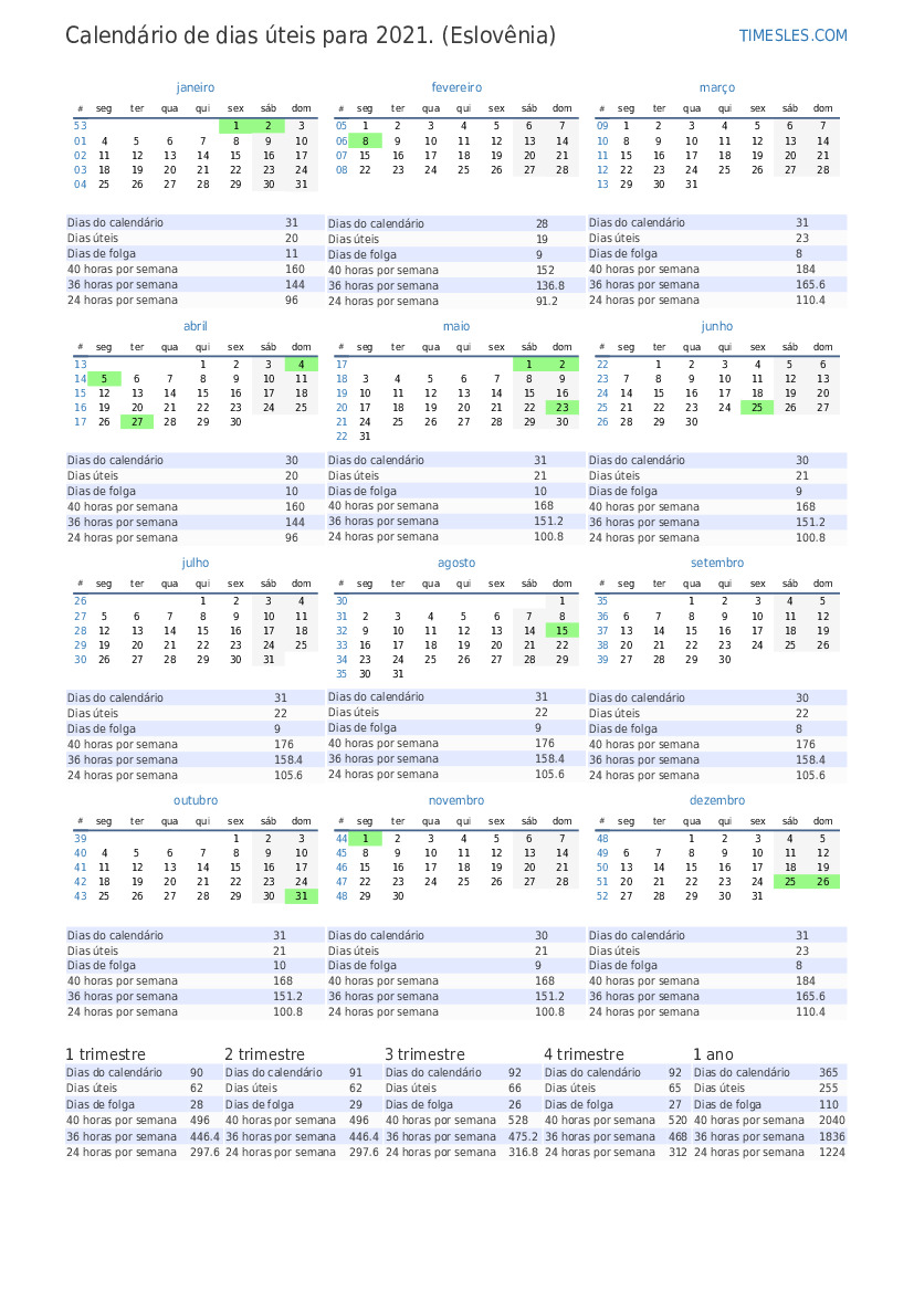 Calendário de dias úteis para dezembro de 2021 para a Eslovênia