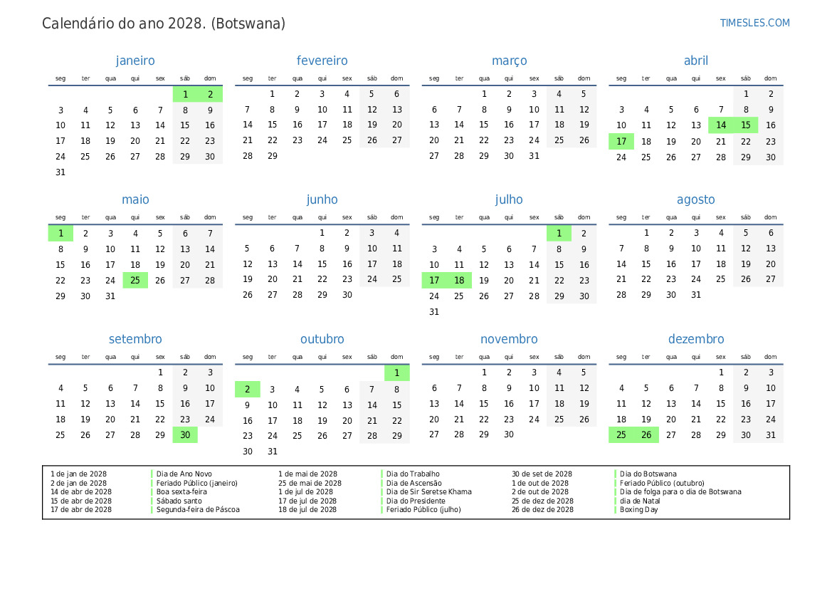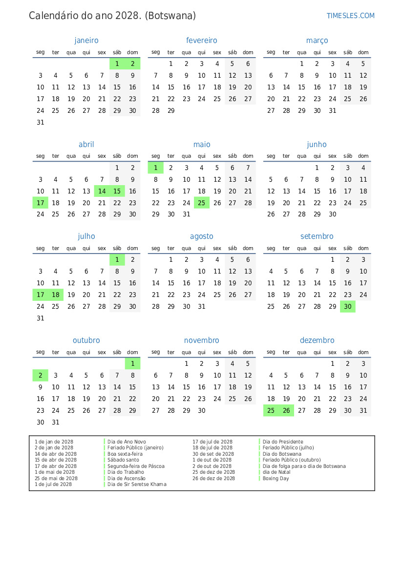 2 de out de 2028 Dia de folga para o dia de Botswana