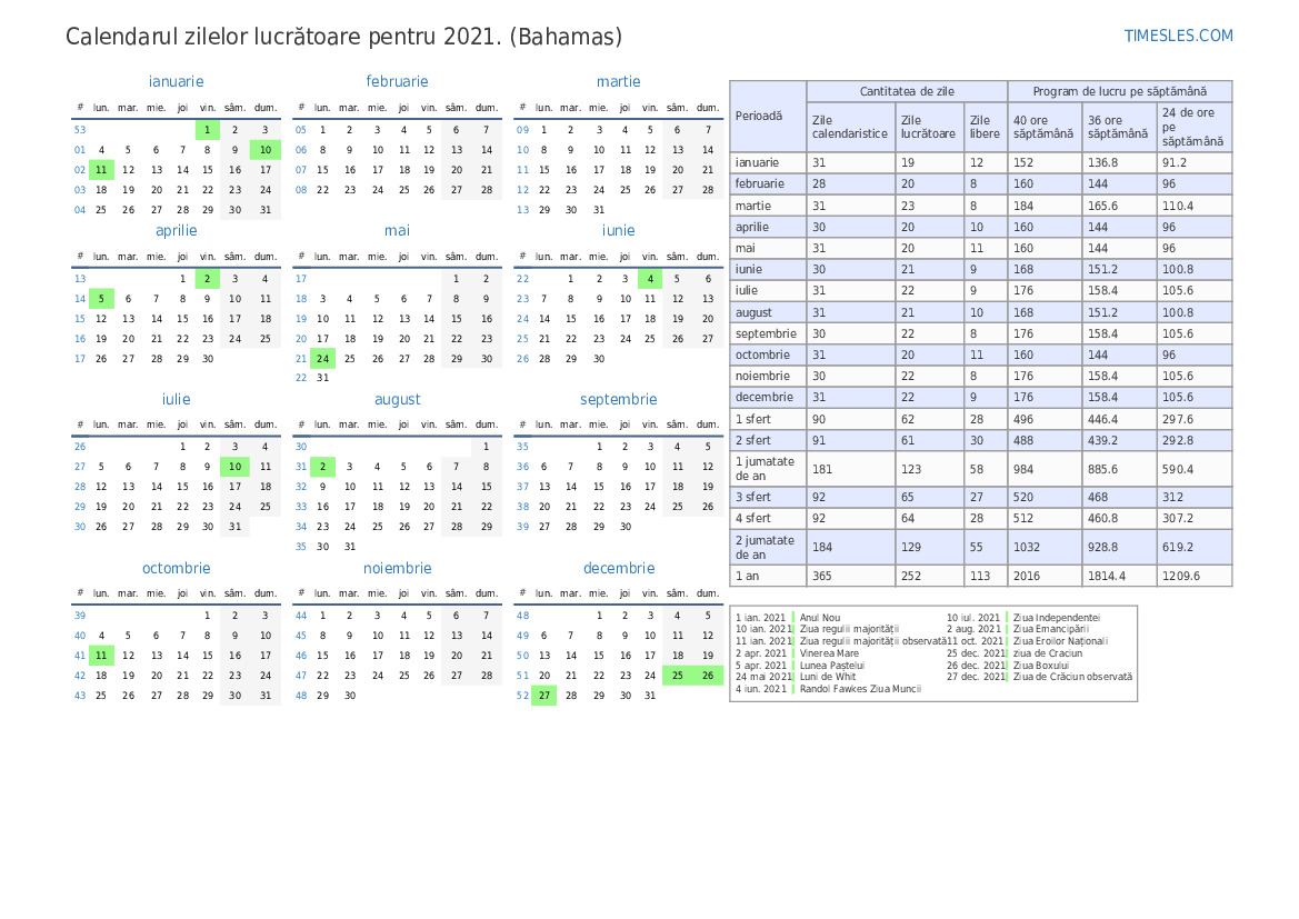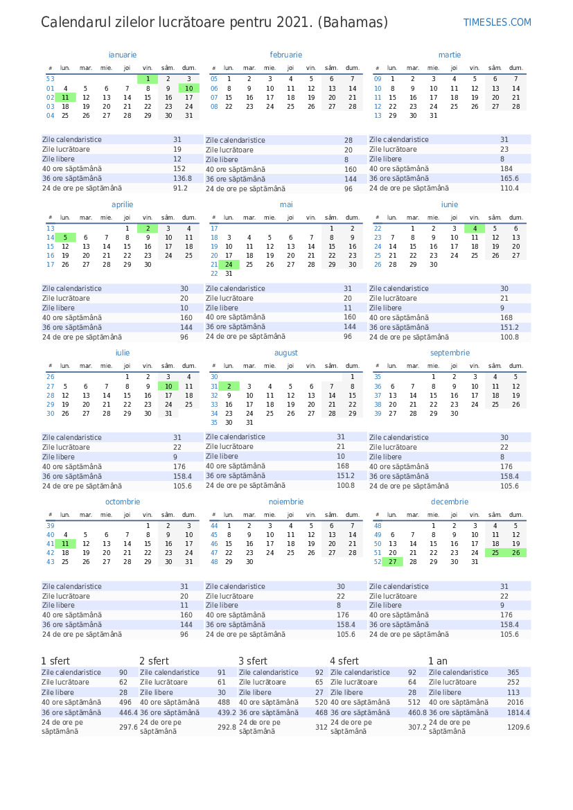 Calendarul zilelor lucrătoare martie 2021 pentru Bahamas