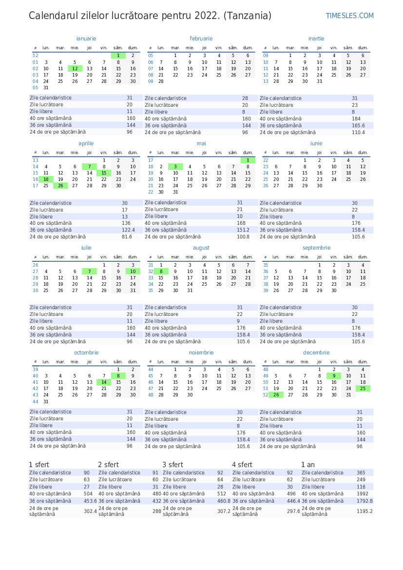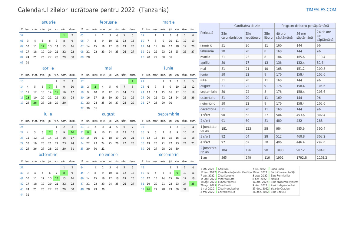 Calendarul zilelor lucrătoare cu sărbători și weekenduri pentru cel de-al 3 trimestru al anului 2022 pentru Tanzania