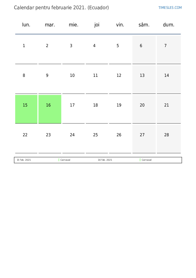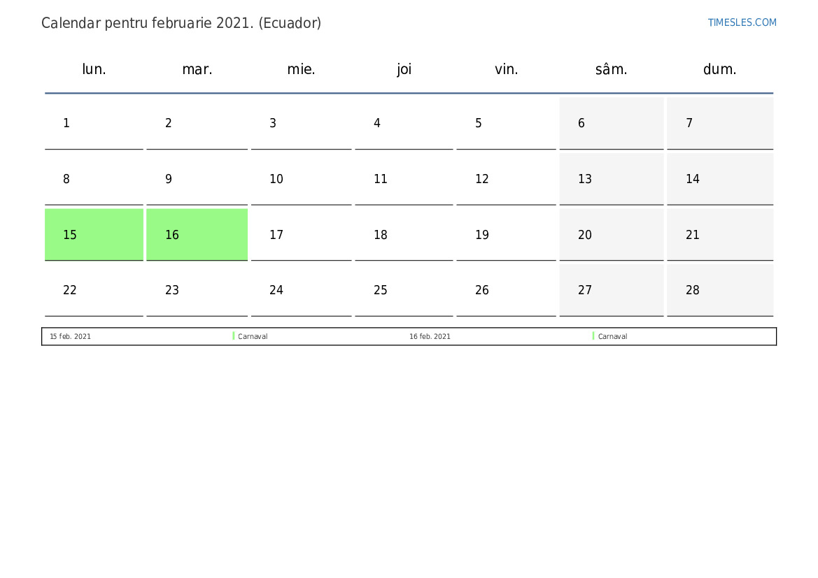 Calendarul sărbătorilor și weekendurilor pentru februarie 2021 pentru Ecuador