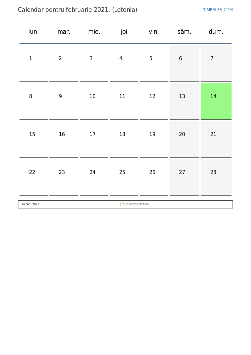 Descărcați și tipăriți calendarul PDF cu sărbătorile și weekendurile pentru februarie 2021 pentru Letonia