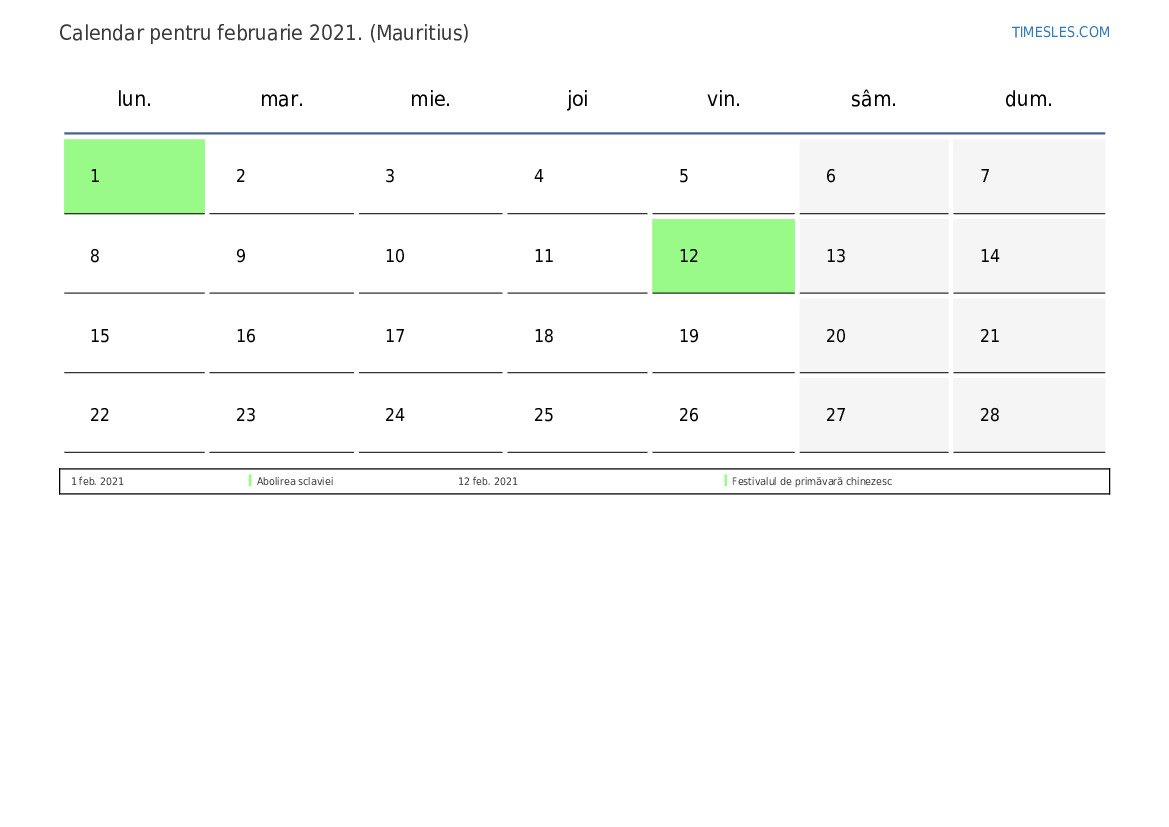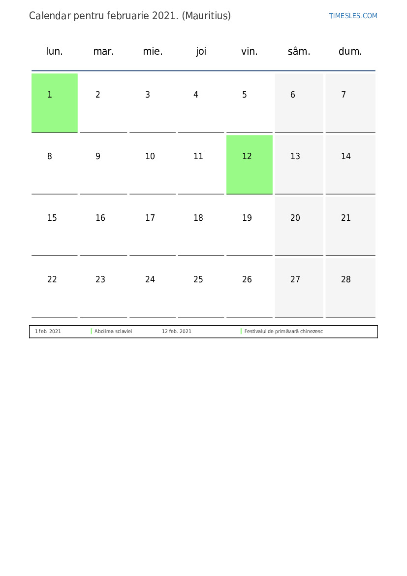 Descărcați și tipăriți calendarul PDF cu sărbătorile și weekendurile pentru februarie 2021 pentru Mauritius