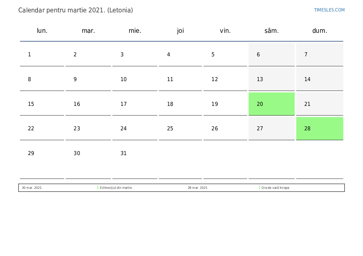 Descărcați și tipăriți calendarul PDF cu sărbătorile și weekendurile pentru martie 2021 pentru Letonia