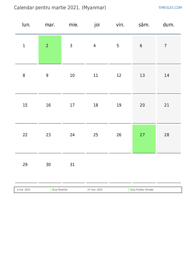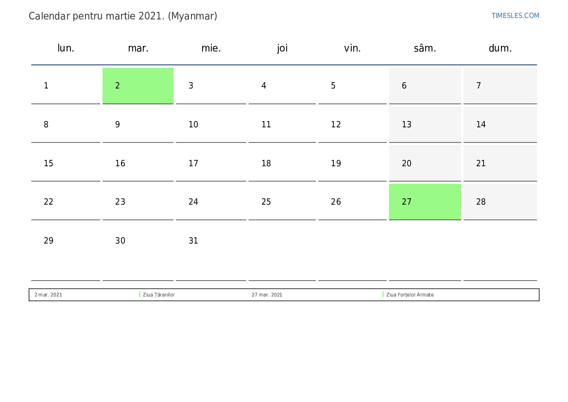 Luna martie conține 31 de zile. Aceasta este 3 lună din 2021. Sezonul anului: arc. Luna martie începe luni și se termină miercuri. În luna martie 2021, sunt 3 sărbători și zile libere în Myanmar.