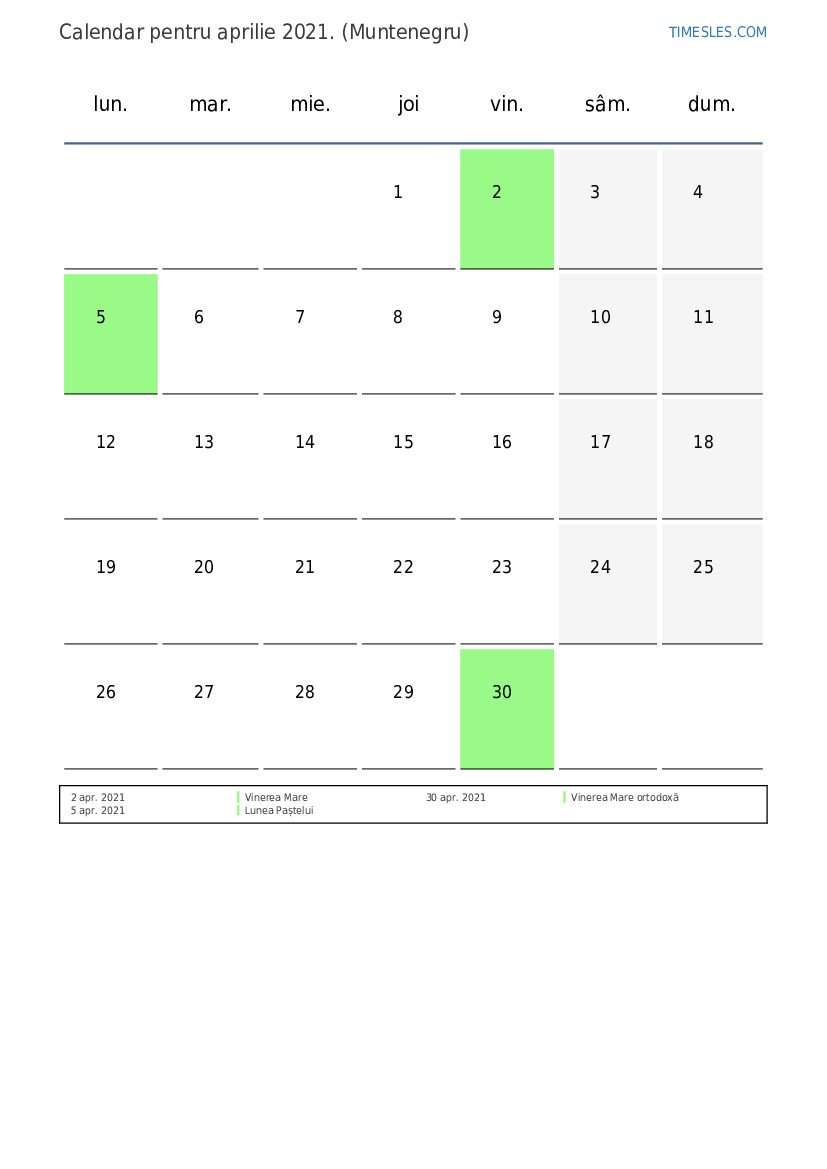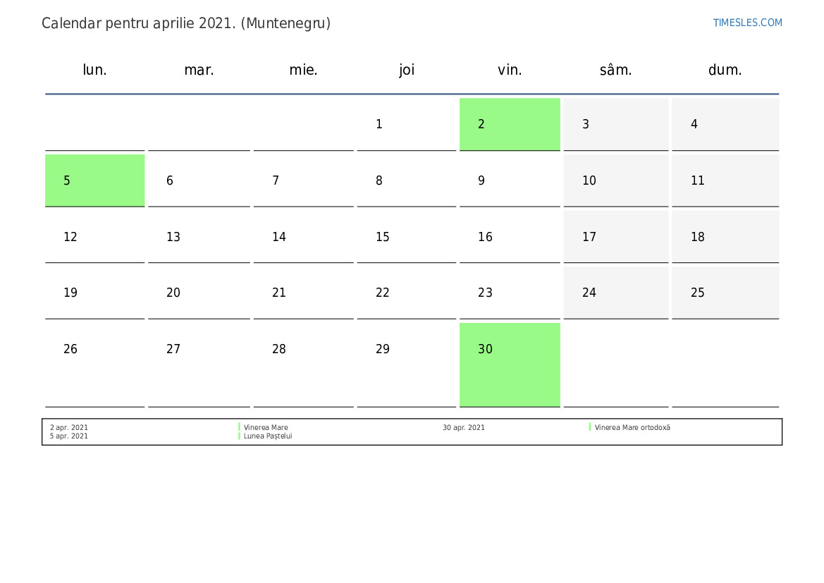 Descărcați și tipăriți calendarul PDF cu sărbătorile și weekendurile pentru aprilie 2021 pentru Muntenegru