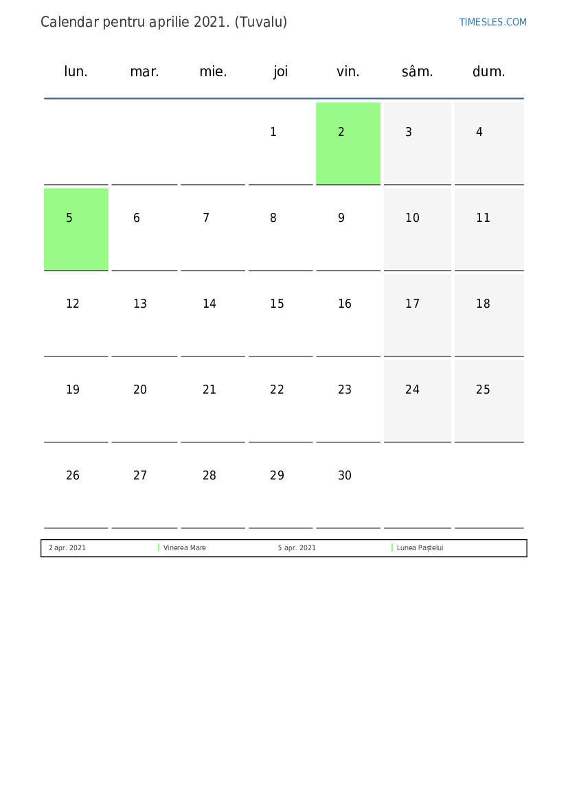 Descărcați și tipăriți calendarul PDF cu sărbătorile și weekendurile pentru aprilie 2021 pentru Tuvalu
