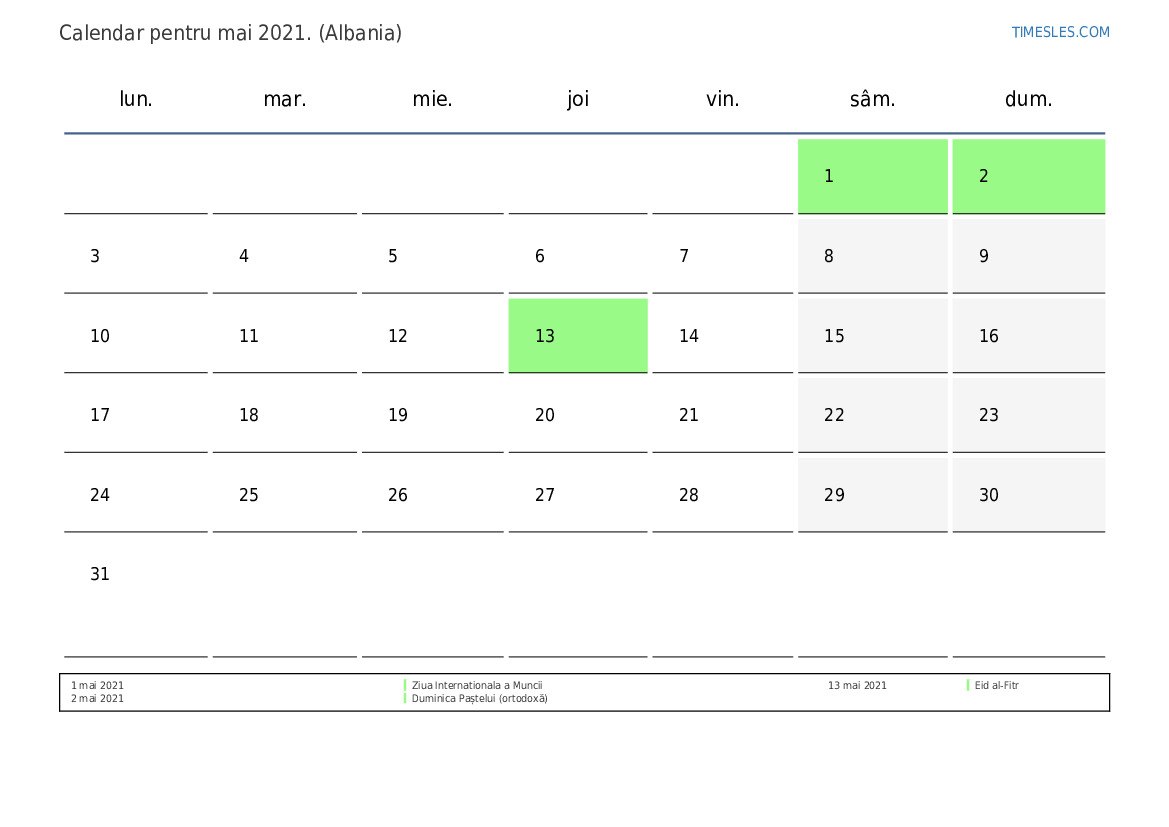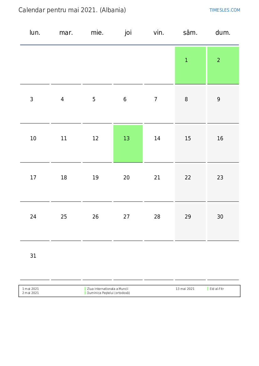 Calendarul sărbătorilor și weekendurilor pentru mai 2021 pentru Albania