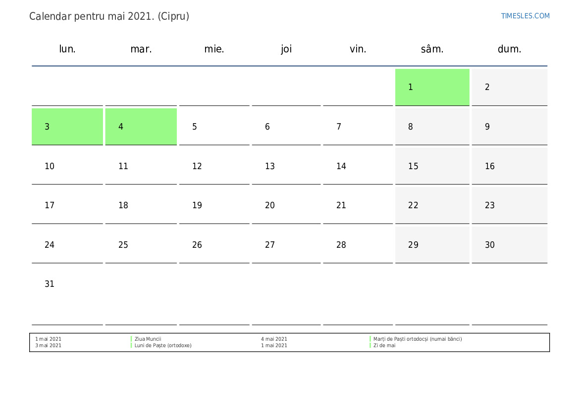 Descărcați și tipăriți calendarul PDF cu sărbătorile și weekendurile pentru mai 2021 pentru Cipru