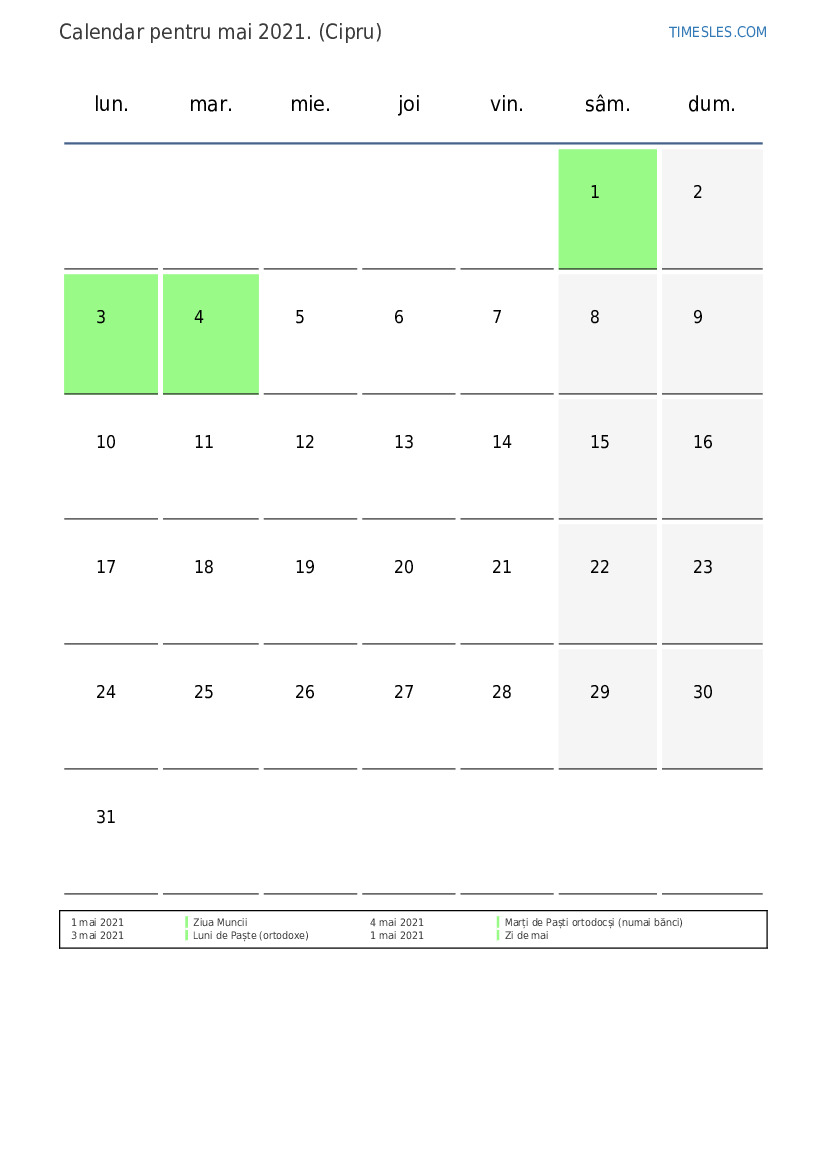 Calendarul sărbătorilor și weekendurilor pentru mai 2021 pentru Cipru