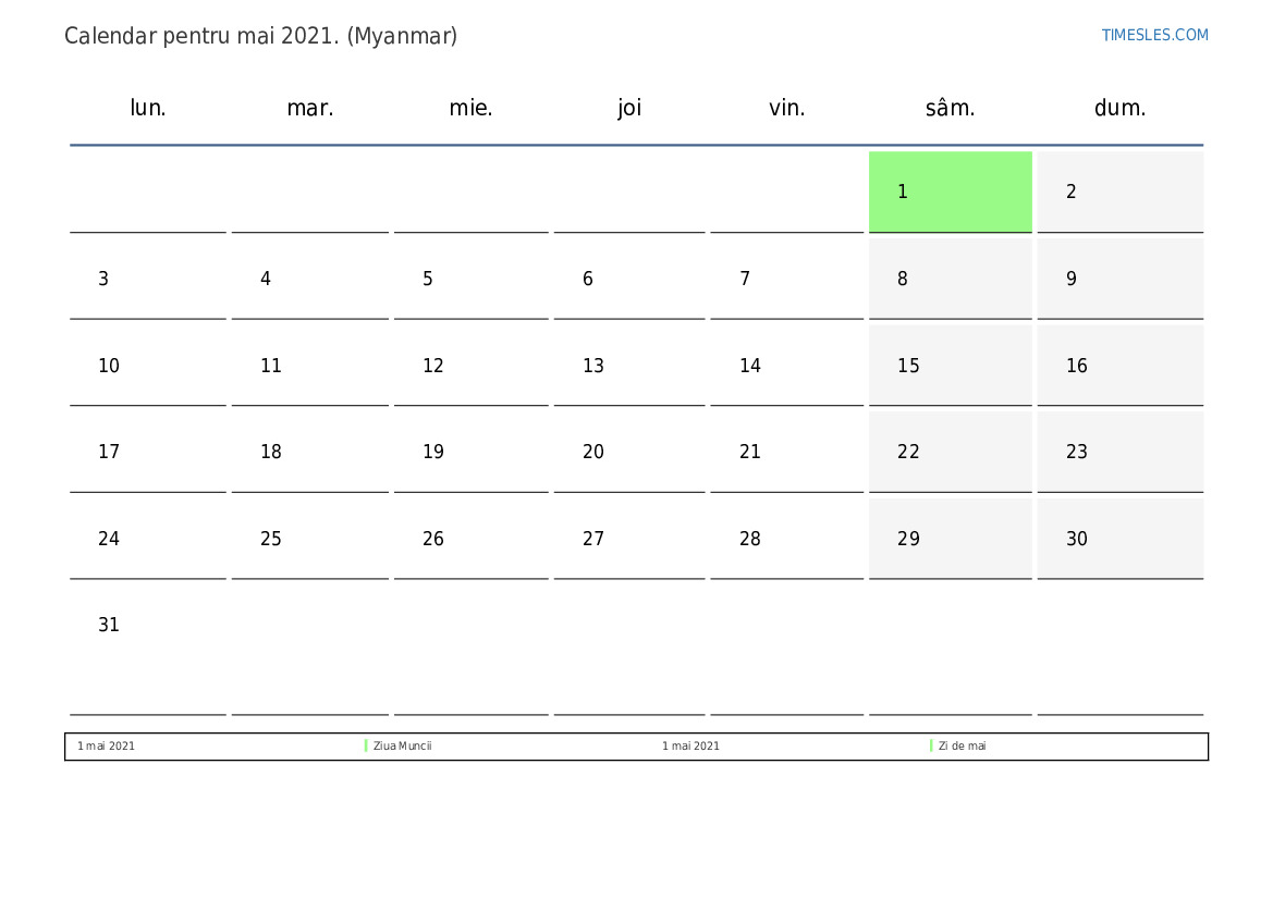 Luna mai conține 31 de zile. Aceasta este 5 lună din 2021. Sezonul anului: arc. Luna mai începe sâmbăta și se termină luni. În luna mai 2021, sunt 2 sărbători și zile libere în Myanmar.