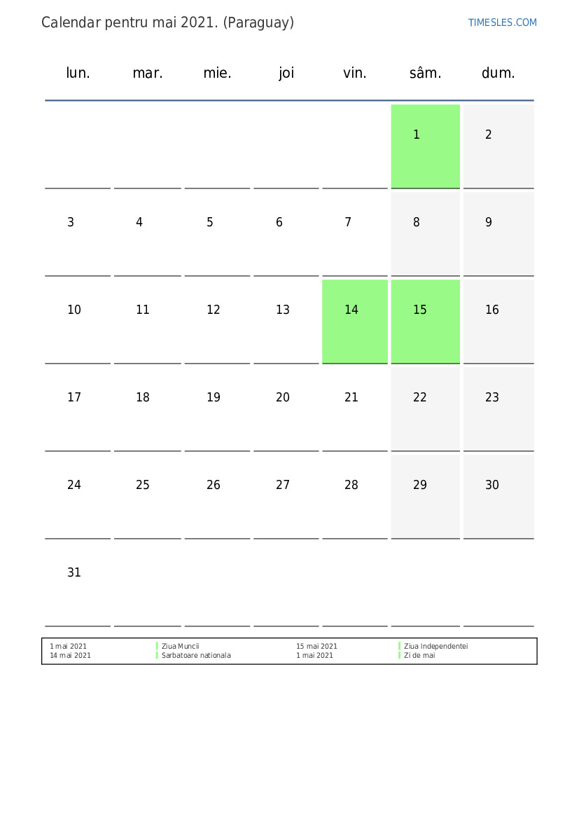Calendarul sărbătorilor și weekendurilor pentru mai 2021 pentru Paraguay