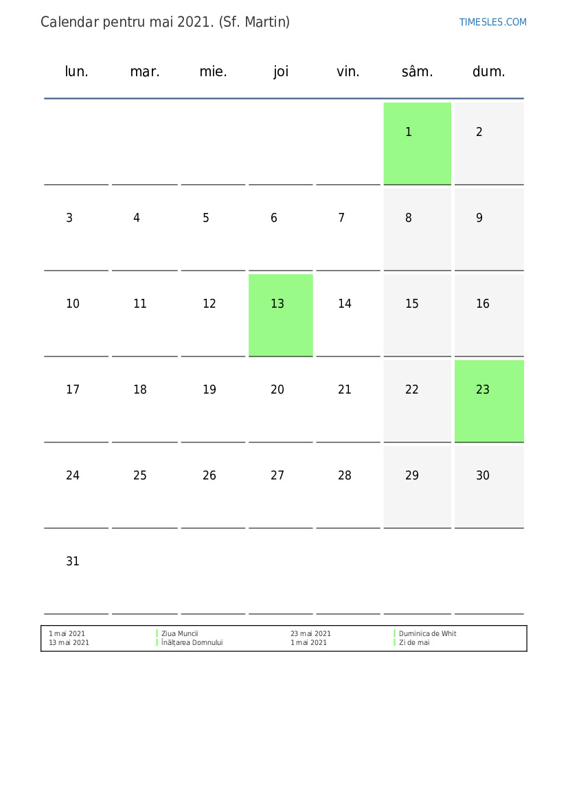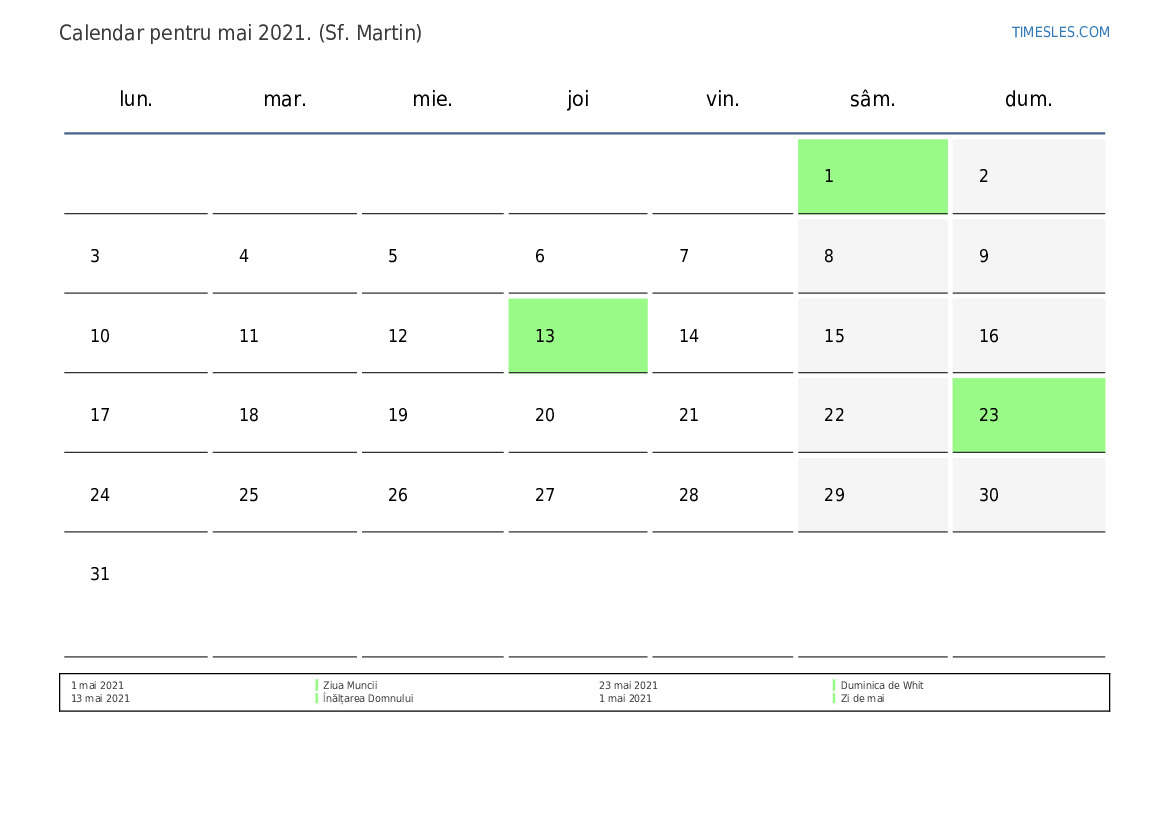 Luna mai conține 31 de zile. Aceasta este 5 lună din 2021. Sezonul anului: arc. Luna mai începe sâmbăta și se termină luni. În luna mai 2021, sunt 4 sărbători și zile libere în Sint Maarten.