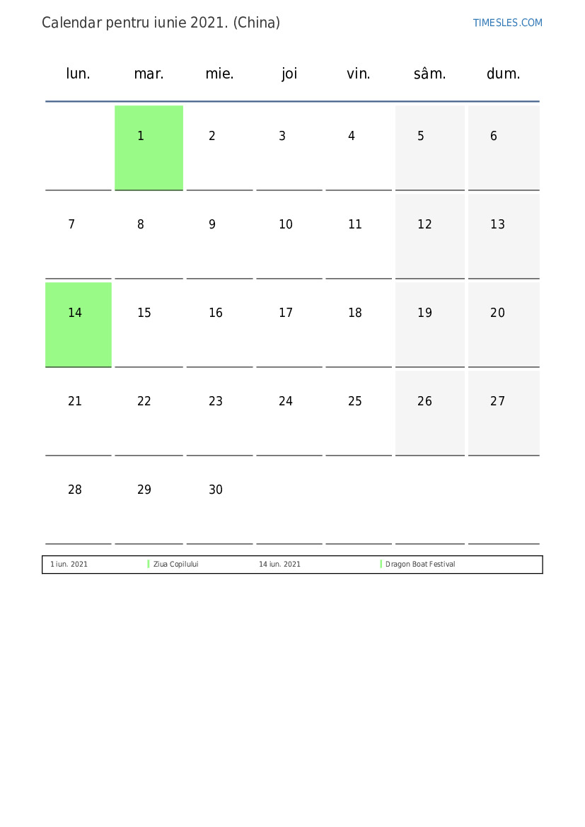 Descărcați și tipăriți calendarul PDF cu sărbătorile și weekendurile pentru iunie 2021 pentru China