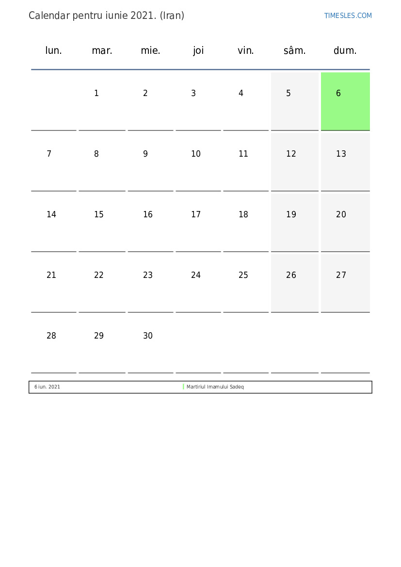 Descărcați și tipăriți calendarul PDF cu sărbătorile și weekendurile pentru iunie 2021 pentru Iran