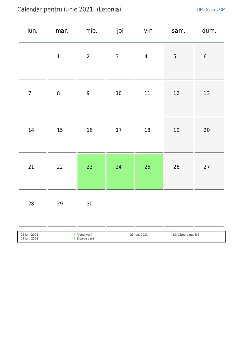 Descărcați și tipăriți calendarul PDF cu sărbătorile și weekendurile pentru iunie 2021 pentru Letonia