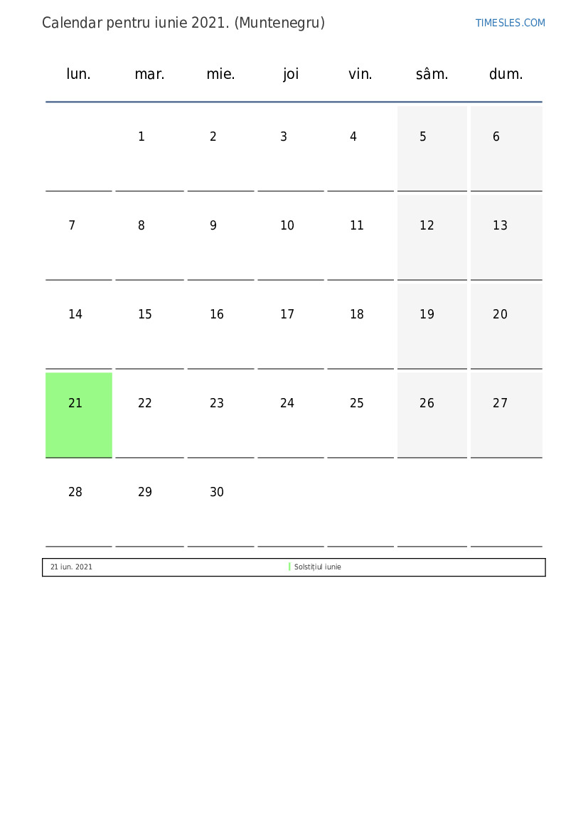Descărcați și tipăriți calendarul PDF cu sărbătorile și weekendurile pentru iunie 2021 pentru Muntenegru