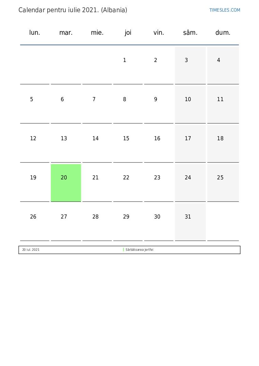 Descărcați și tipăriți calendarul PDF cu sărbătorile și weekendurile pentru iulie 2021 pentru Albania