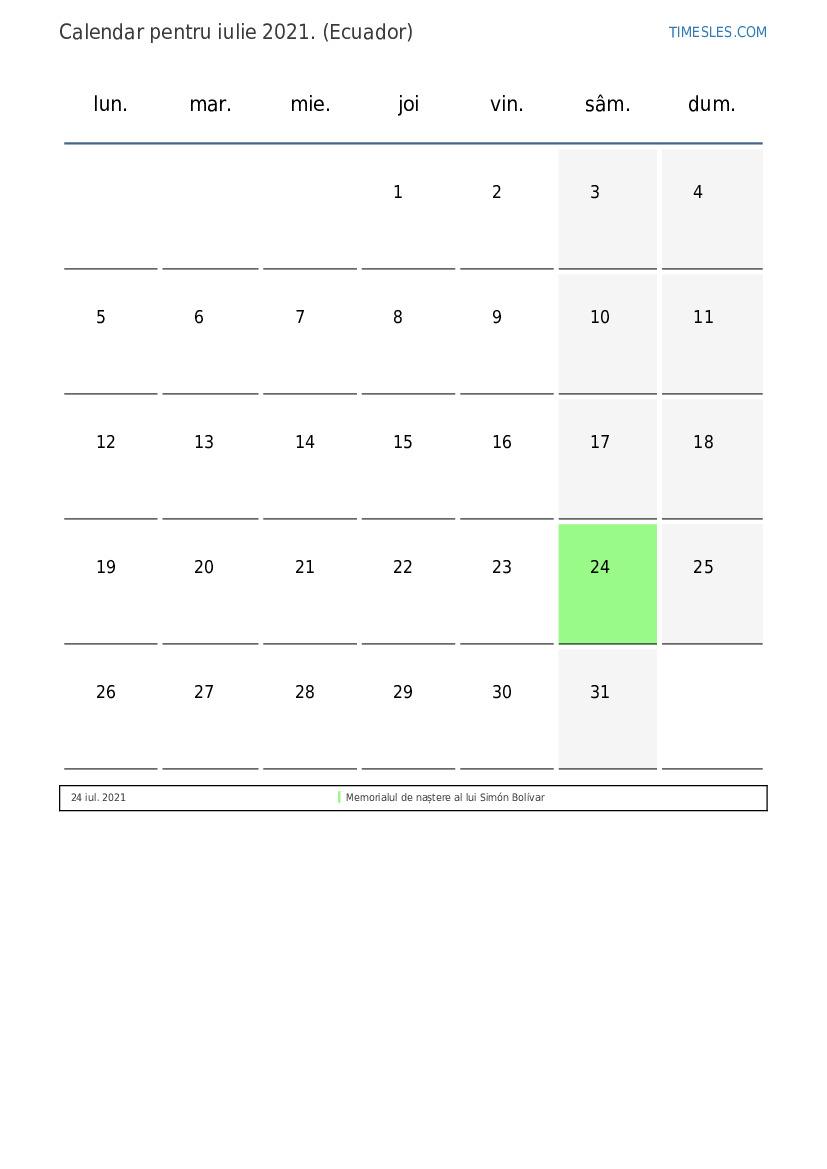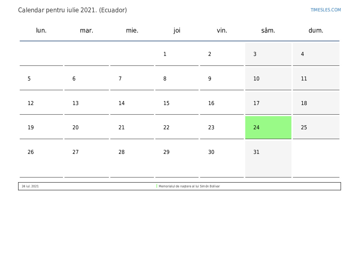 Calendarul sărbătorilor și weekendurilor pentru iulie 2021 pentru Ecuador