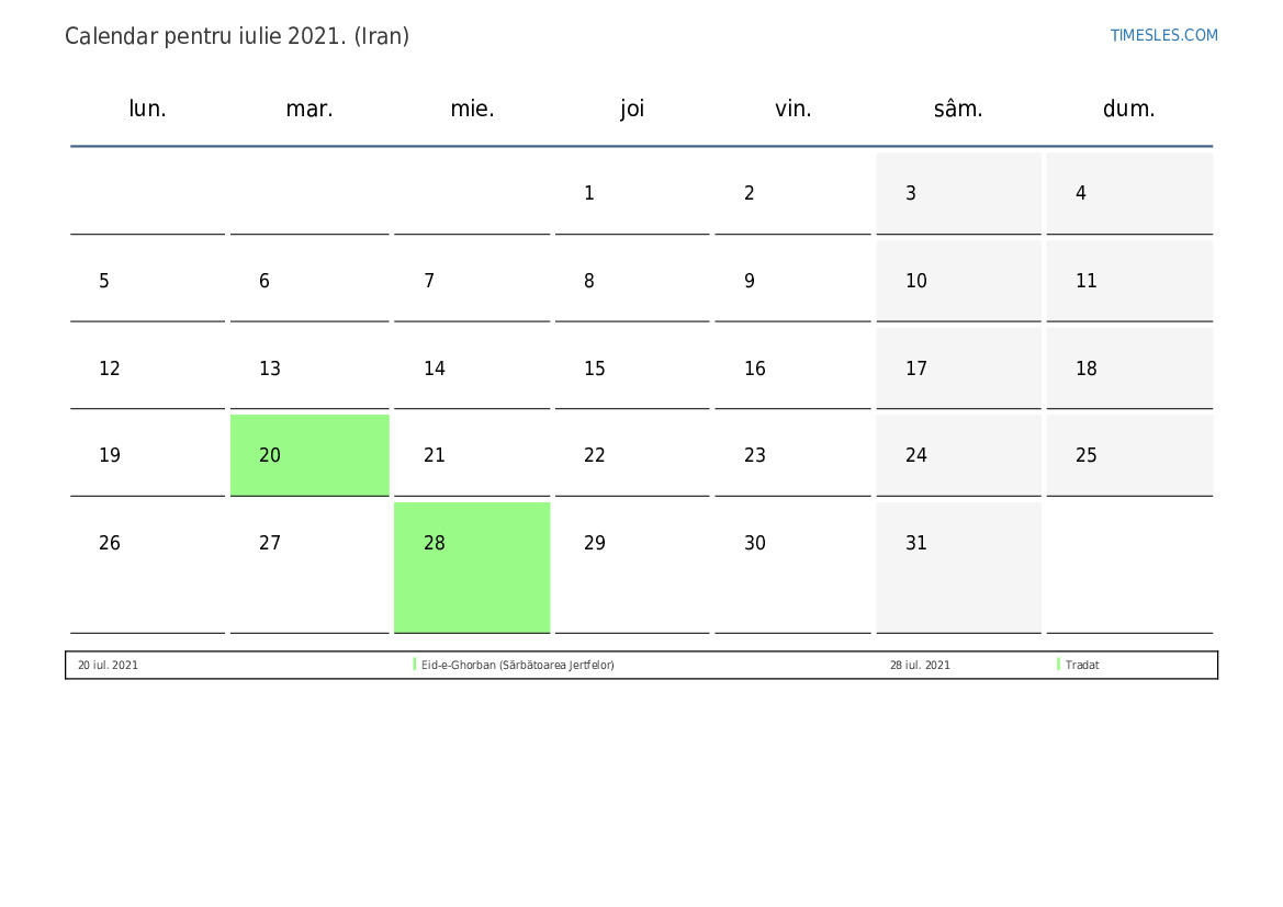 Descărcați și tipăriți calendarul PDF cu sărbătorile și weekendurile pentru iulie 2021 pentru Iran