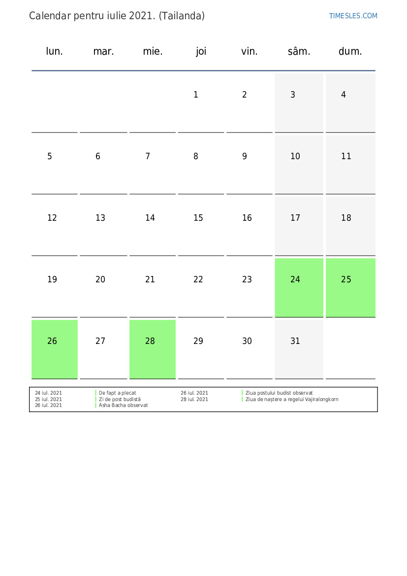 Calendarul sărbătorilor și weekendurilor pentru iulie 2021 pentru Thailanda