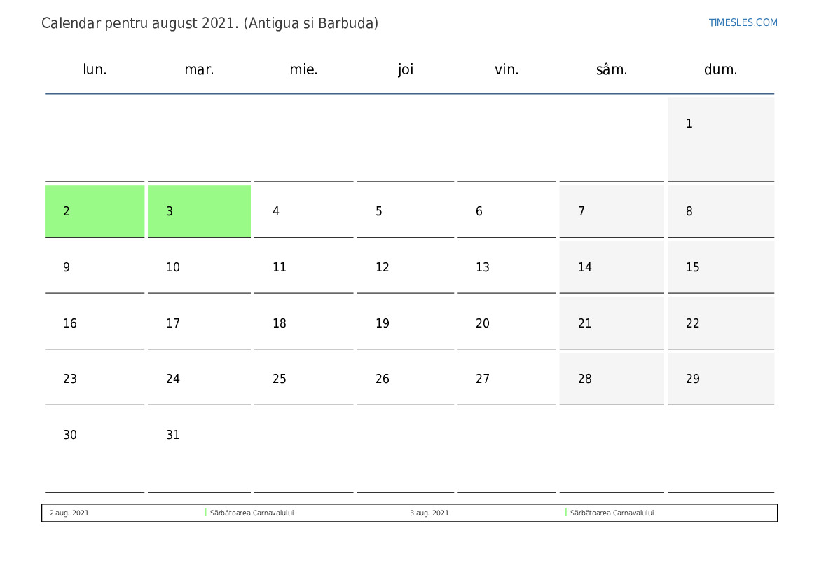 Descărcați și tipăriți calendarul PDF cu sărbătorile și weekendurile pentru august 2021 pentru Antigua și Barbuda